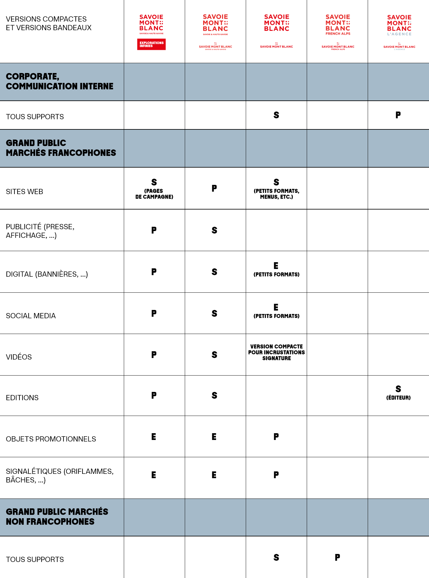 Ce tableau explique comment choisir le logo approprié pour chaque type de communication ou selon la cible.
